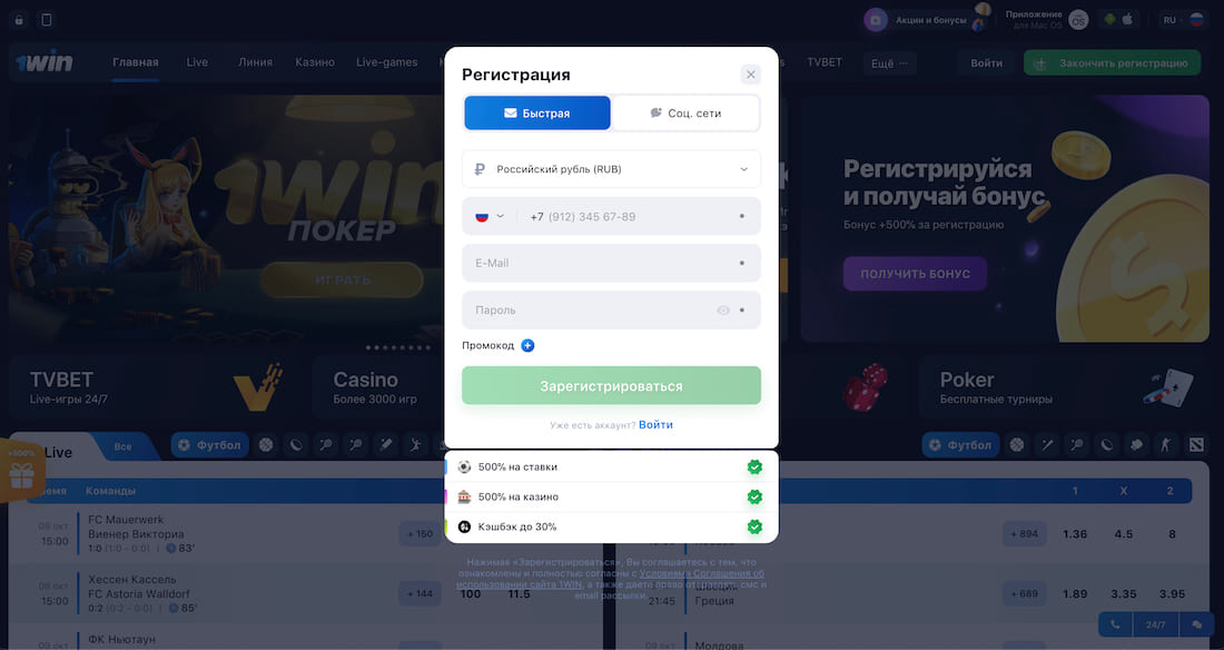 Регистрация на официальном сайте букмекерской конторы 1вин занимает не более пары минут. Перейдите на главную страницу сайта, нажмите соответствующую кнопку и заполните форму для ввода персональных данных. Укажите следующую информацию: